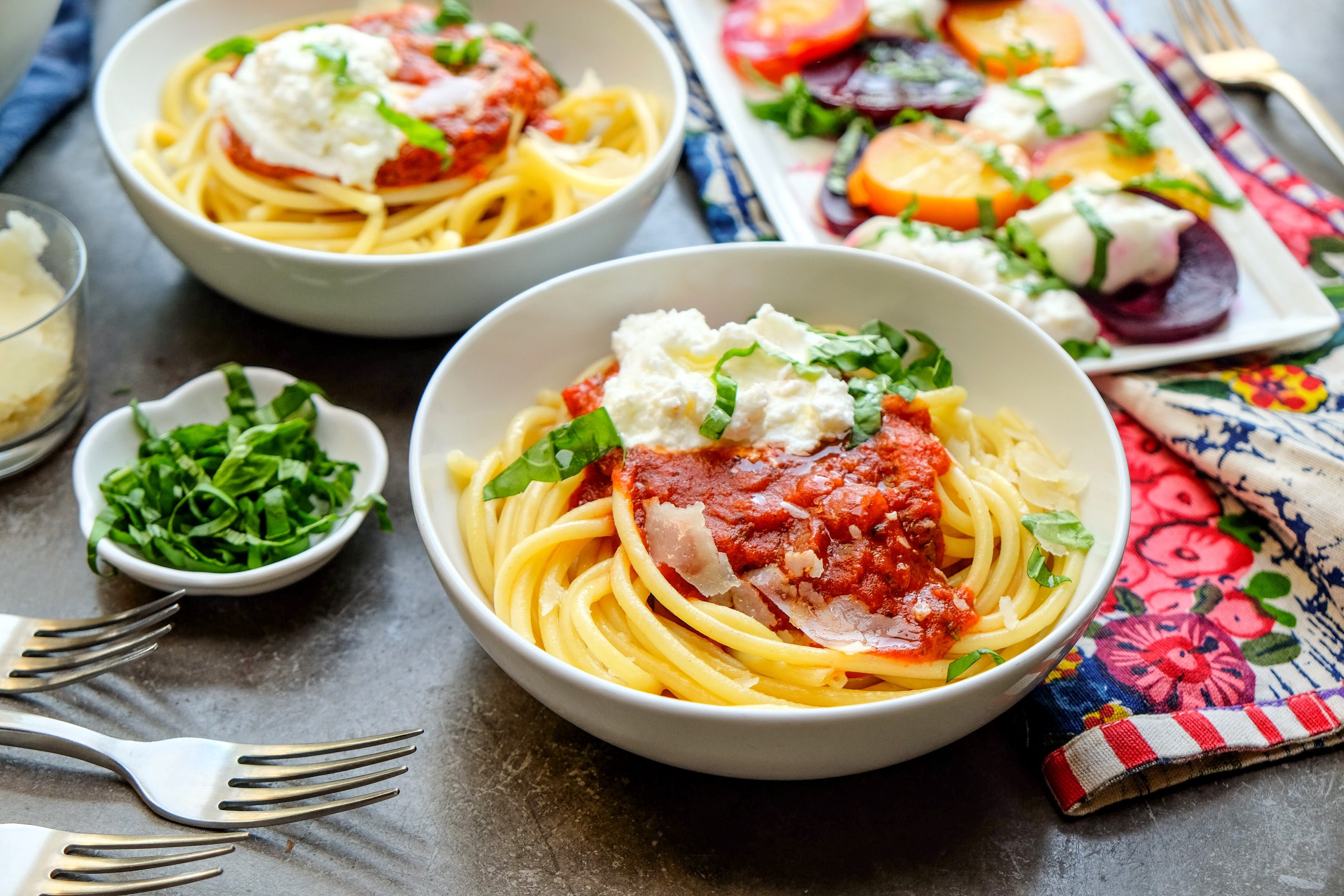 Guest Recipe from One Potato: Bucatini with Marinara Sauce & Herb-Whipped Ricotta (V/GF optional) - featured below!